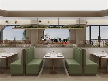 今天分享的是銀川預(yù)海餐廳設(shè)計(jì)裝修效果圖。設(shè)計(jì)師首先要與甲方客戶確定好餐廳改造的設(shè)計(jì)風(fēng)格和主題,基于當(dāng)?shù)氐奈幕?、歷史、自然景觀與特定的概念。風(fēng)格與餐主題的一致性能夠增強(qiáng)餐廳的品牌形象力和吸引力。主案設(shè)計(jì)師根據(jù)客戶的設(shè)計(jì)裝修需求,為其打造出的餐廳設(shè)計(jì)裝修方案。本餐廳設(shè)計(jì)融合了古樸韻味與現(xiàn)代簡(jiǎn)約美學(xué),通過棕色、原木色、綠色主色與天然材質(zhì)的交織,打造出一處具有人文溫度與自然靈性的沉浸式用餐空間。從深咖原木到淺駝墻面,層層遞進(jìn)的棕色奠定沉穩(wěn)基調(diào),綠色的皮質(zhì)沙發(fā)又很清新脫俗,整體給食客的觀感很好。