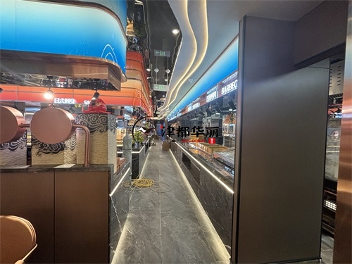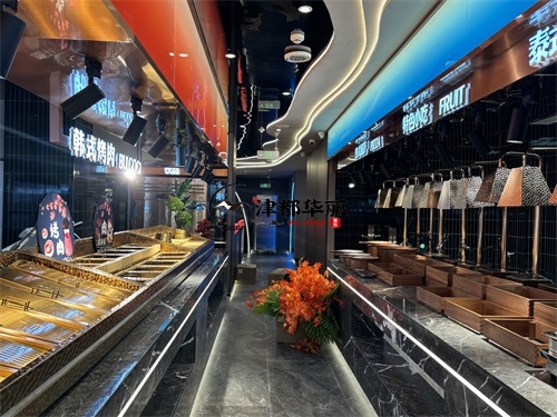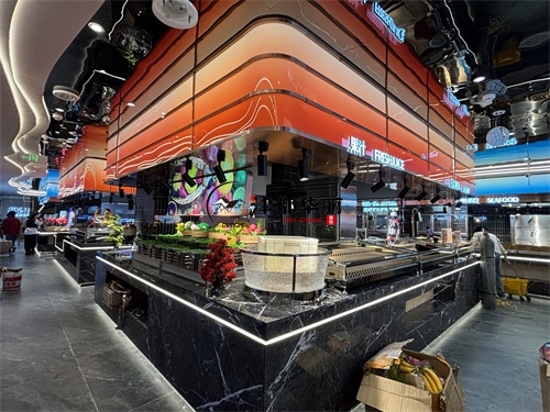 今天分享的是銀川回香漁自助餐廳裝修設計實景,這家自助餐廳裝修設計將“潮流科技感”與“輕奢休閑風”兩種風格巧妙融合在一起,既貼合當下年輕消費群體的審美偏好,又通過空間層次的營造兼顧了自助餐飲的功能需求,是近年餐飲空間設計的典型流行范式。前廳的頂面與墻面采用波浪形的曲面造型,搭配橙紅、寶藍等高飽和度漸變色彩,疊加內(nèi)嵌式線性燈帶的勾勒,既打破了傳統(tǒng)餐廳的規(guī)整感,又通過科技感的光影營造出“賽博休閑”的氛圍——這種手法既借鑒了網(wǎng)紅餐飲的“打卡屬性”設計,又通過色彩分區(qū)(如橙紅對應熱菜區(qū)、寶藍對應海鮮區(qū))實現(xiàn)了功能引導,讓顧客能快速識別餐區(qū)類型。
