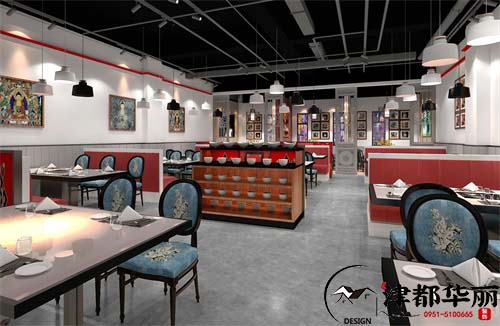 整體空間設(shè)計(jì)充滿(mǎn)了濃郁的地域風(fēng)情,色彩搭配用了紅藍(lán)白,潔白的墻面給人的感覺(jué)就是自然純凈,藍(lán)白的桌椅像草原上的天空般蔚藍(lán)清澈,紅色代表了藏族人以及老板熱情待客的豪爽性格,搭配地域元素的飾品、畫(huà)作的裝飾,使空間更具有特色。在這里,不僅有不同的舌尖美味享受,還能讓人有身臨其境藏族風(fēng)情的空間體驗(yàn)。